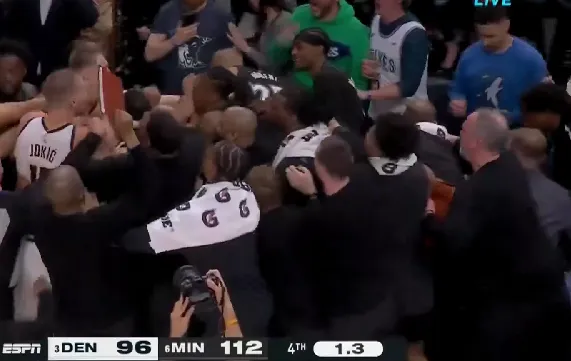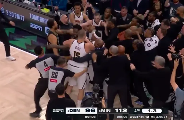 第四节比赛中,麦丹最后时刻上篮,约基奇后场冲过来推搡爆发大范围冲突。
