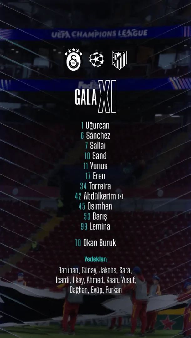 虎扑01月22日讯 北京时间1月22日凌晨1时45分,2025-26赛季欧冠联赛第7轮,加拉塔萨雷和马德里竞技在拉姆斯公园球场展开对决。赛前两队公布了本场比赛的首发名单。