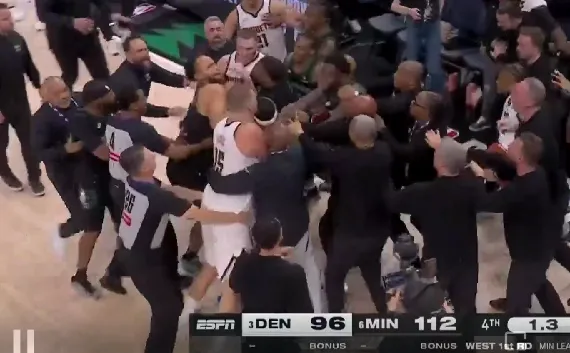 第四节比赛中,麦丹最后时刻上篮,约基奇后场冲过来推搡爆发大范围冲突。